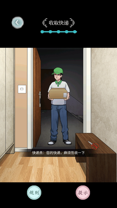 点击门,随后点击左侧开关打开灯,将剪刀拖动到快递包裹上,点击包裹内的纸条即可通关。