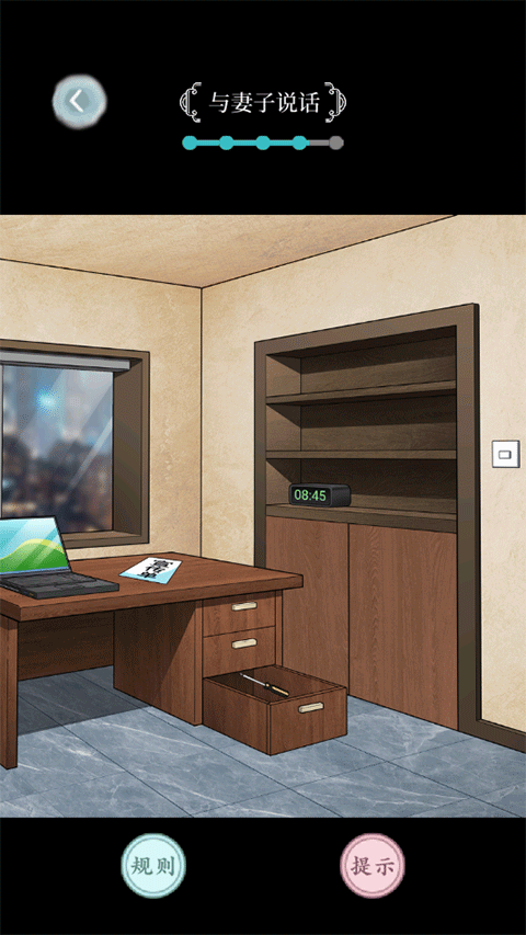 然后点击房门,妻子会出现,将妻子头上的发夹移至桌面,再点击她手中的汤,等待灯光闪烁后点击桌下的纸条。